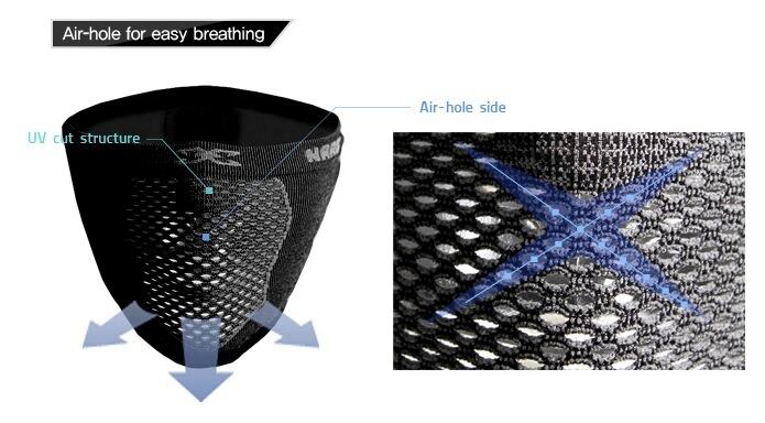 激しいアクティビティにより、多くの酸素が必要な場合や口の中に虫が入るのを防止する「目の粗いフィルター面」と、空気中のホコリをより細かく除去し防寒効果が高い「目の細かいフィルター面」、前後2面のリバーシブルフィルター構造です。