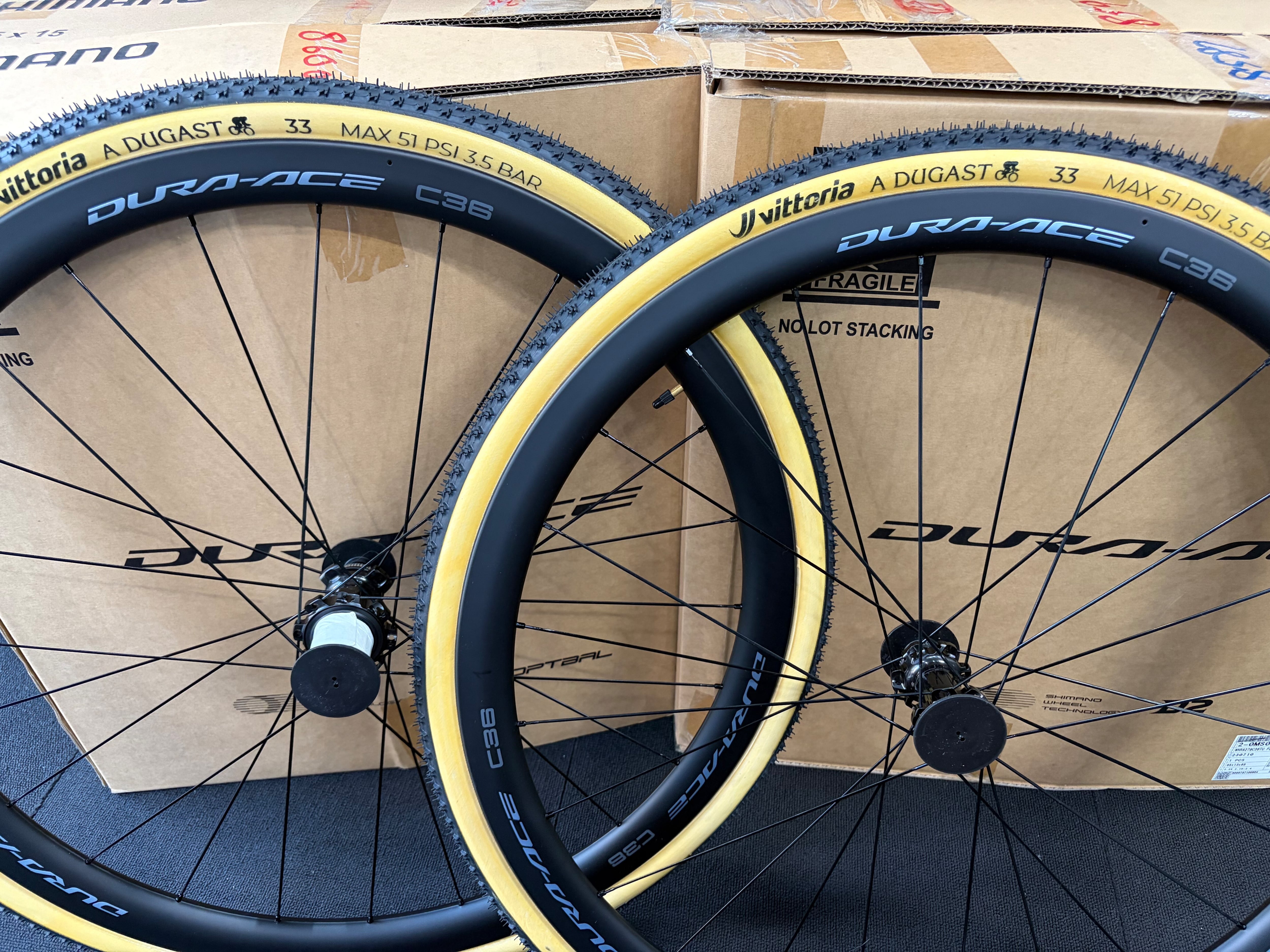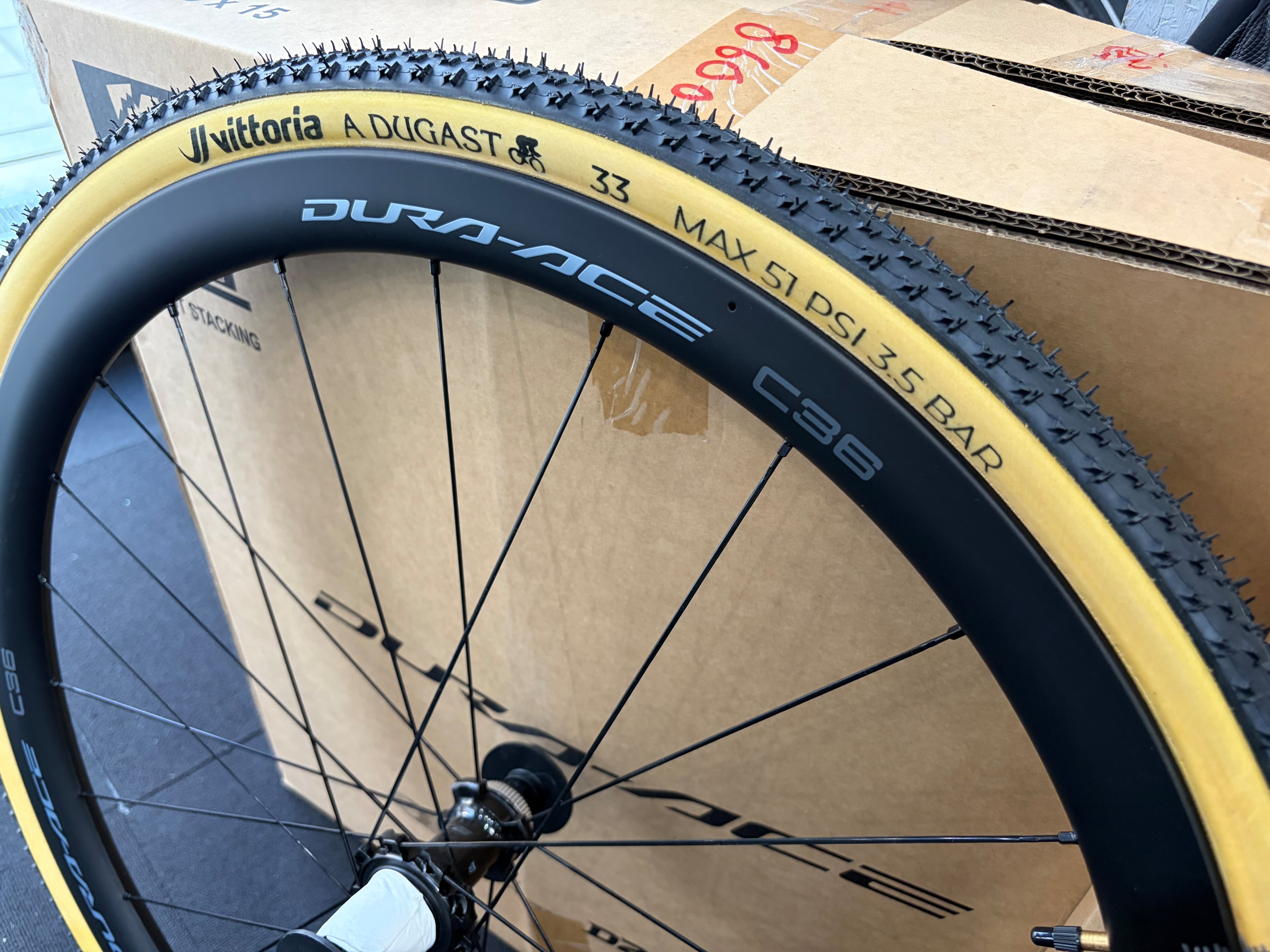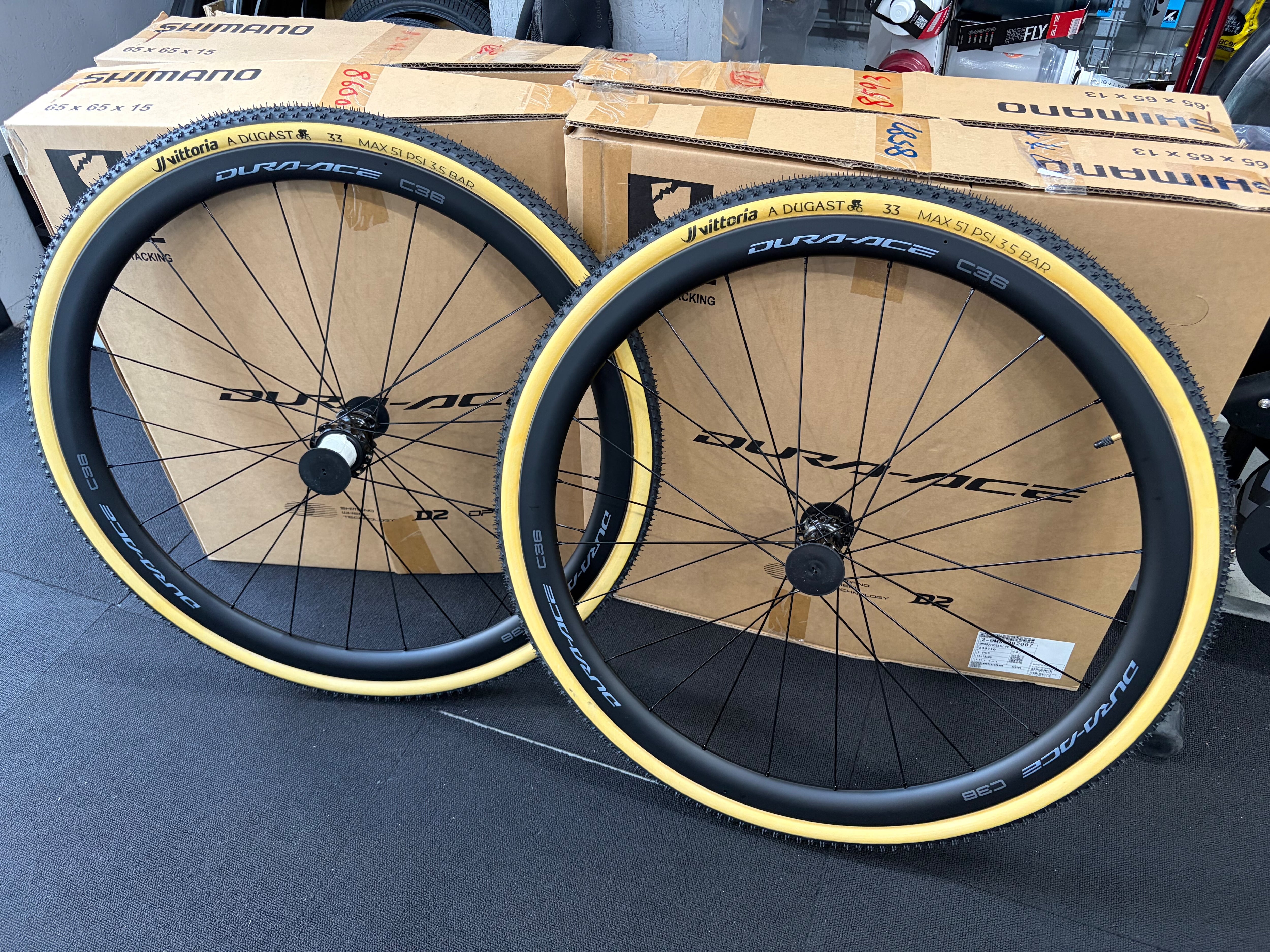 Shimano duraace R9270 のC36チューブラーホイールにVittoria A.Dugastのチューブラータイヤを貼り、アクアシール施工までした状態でお届けします。シクロクロス用にいかがでしょうか?